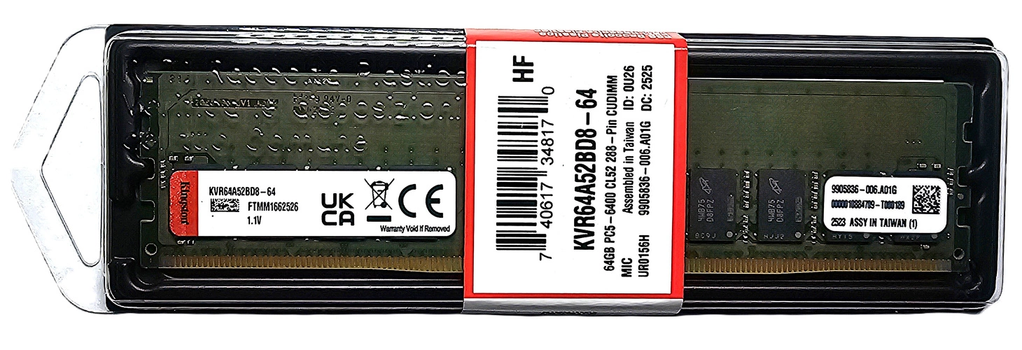 - Kit de RAM 64 GB que consiste en 1x 64GB Kingston ValueRAM DDR5 2Rx8 6400MHz PC5-51200 CUDIMM | KVR64A52BD8-64