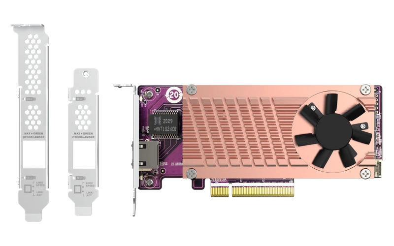 - El QM2-2P10G1TB facilita la adición de dos SSD M.2 NVMe y funciones de conectividad 10GbE RJ45 a su ordenador/estación de trabajo.